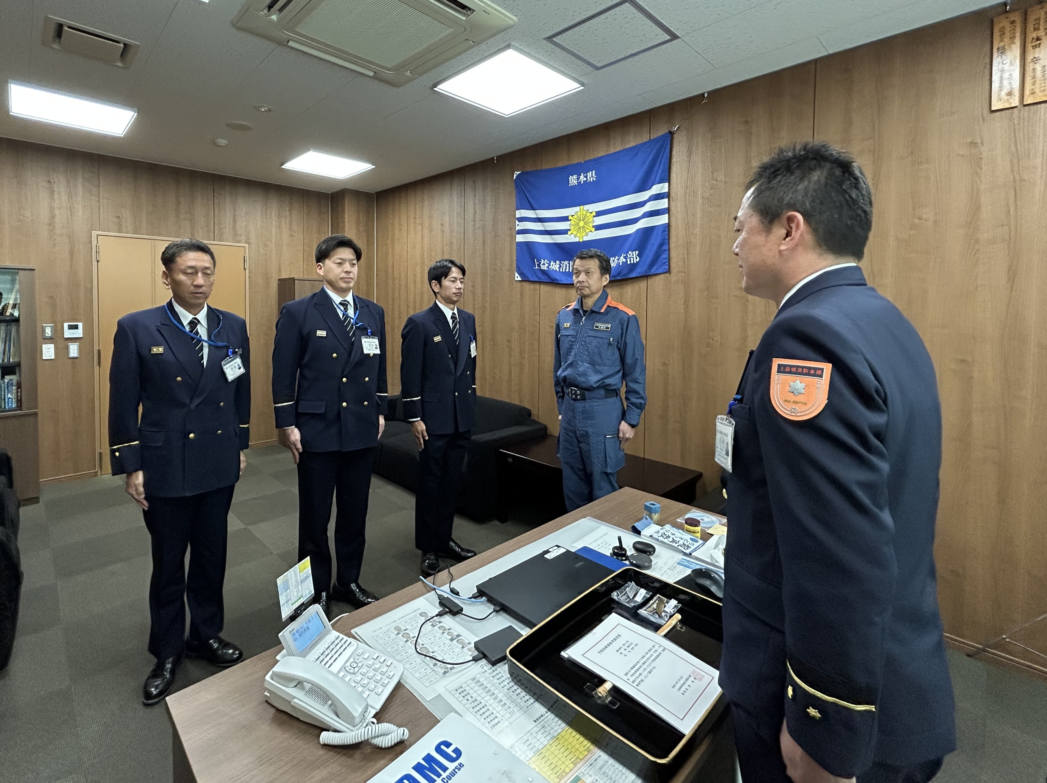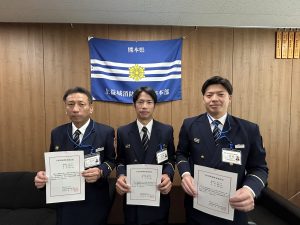 令和8年2月4日(水)に上益城消防本部消防長室にて、予防技術検定に合格し消防力の整備指針第32条第3項に規定する「予防技術資格者」として新たに認定された4名(交付式出席者は3名)の職員に対し、認定証及び予防技術資格者プレートを交付しました。