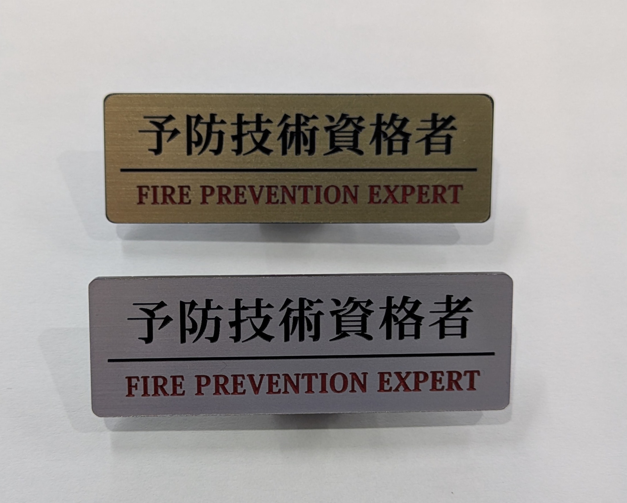 当消防本部においては、予防技術資格者プレートは予防技術資格者の「防火査察」「消防用設備等」「危険物」の認定区分数に応じて変わり、1区分の認定からは「銀章」を交付し、3区分すべての認定を受けた場合は「金章」を交付しております。