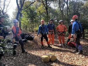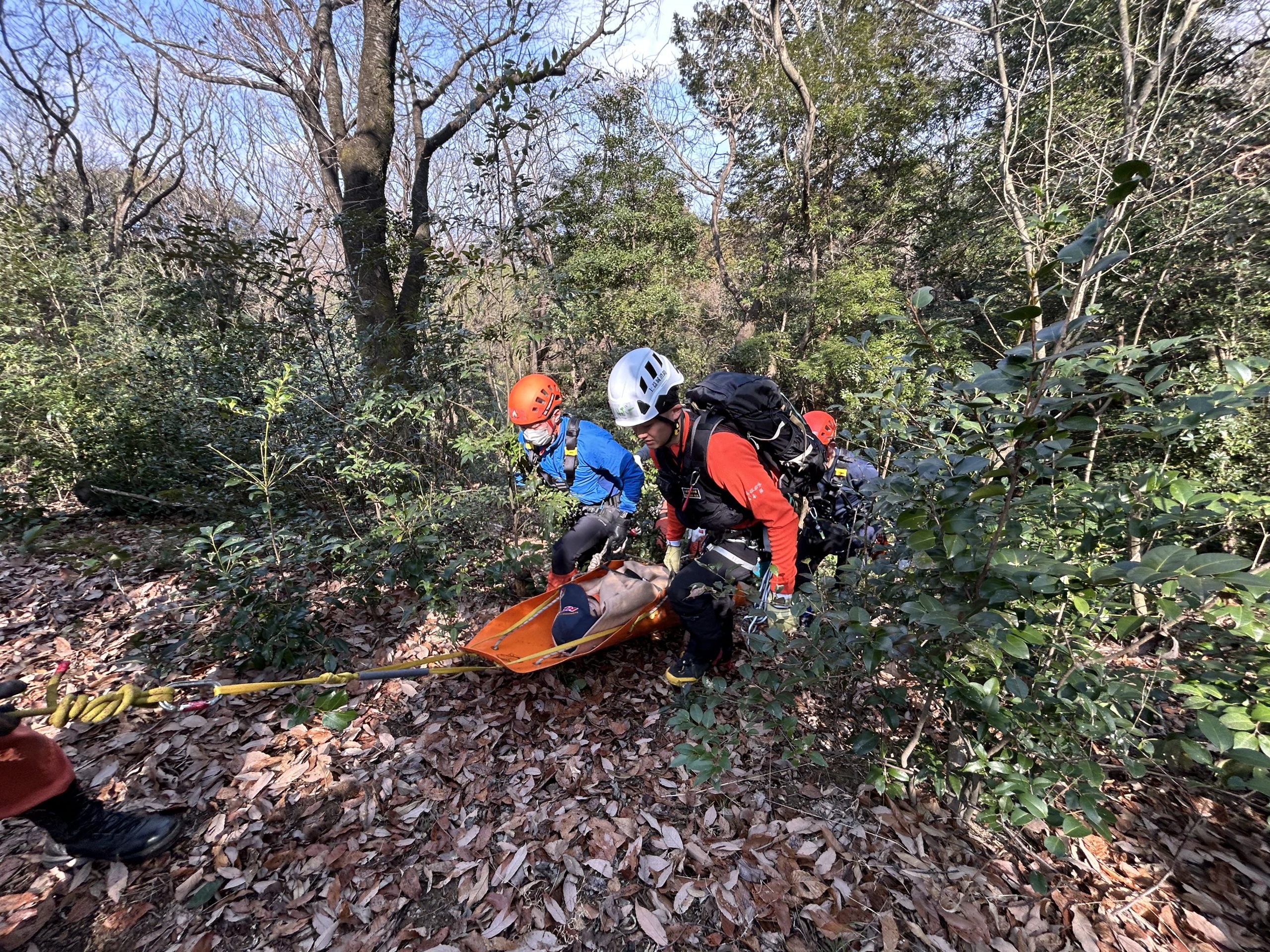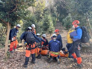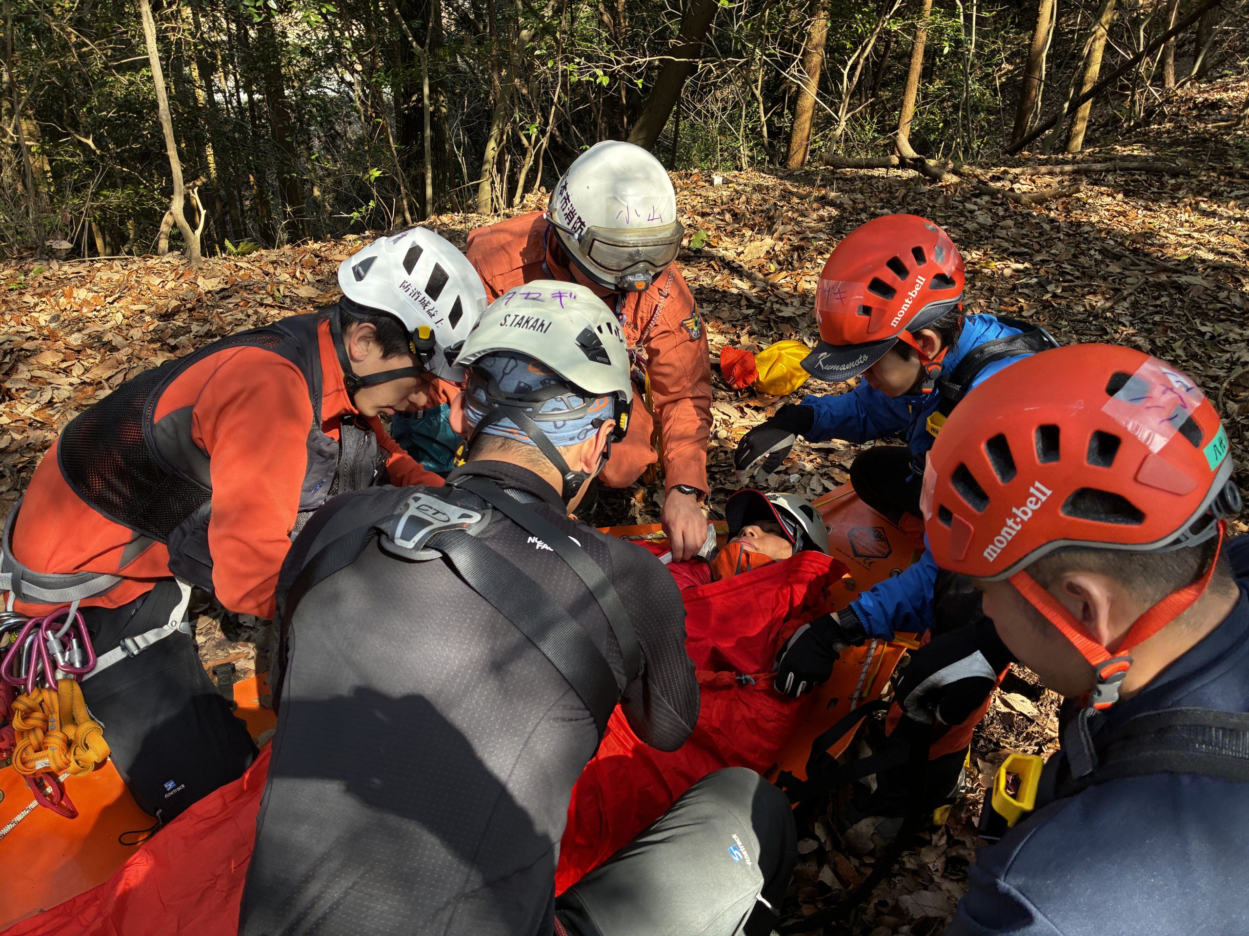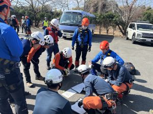 訓練では、山岳遭難事案を想定し、3班に分かれてお互いの知識・技術を共有しながら救出から搬送に至るまで隊員が協力しながら有意義な訓練となりました。