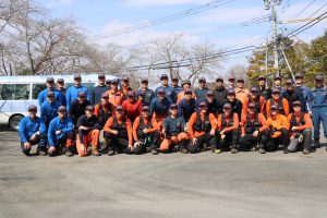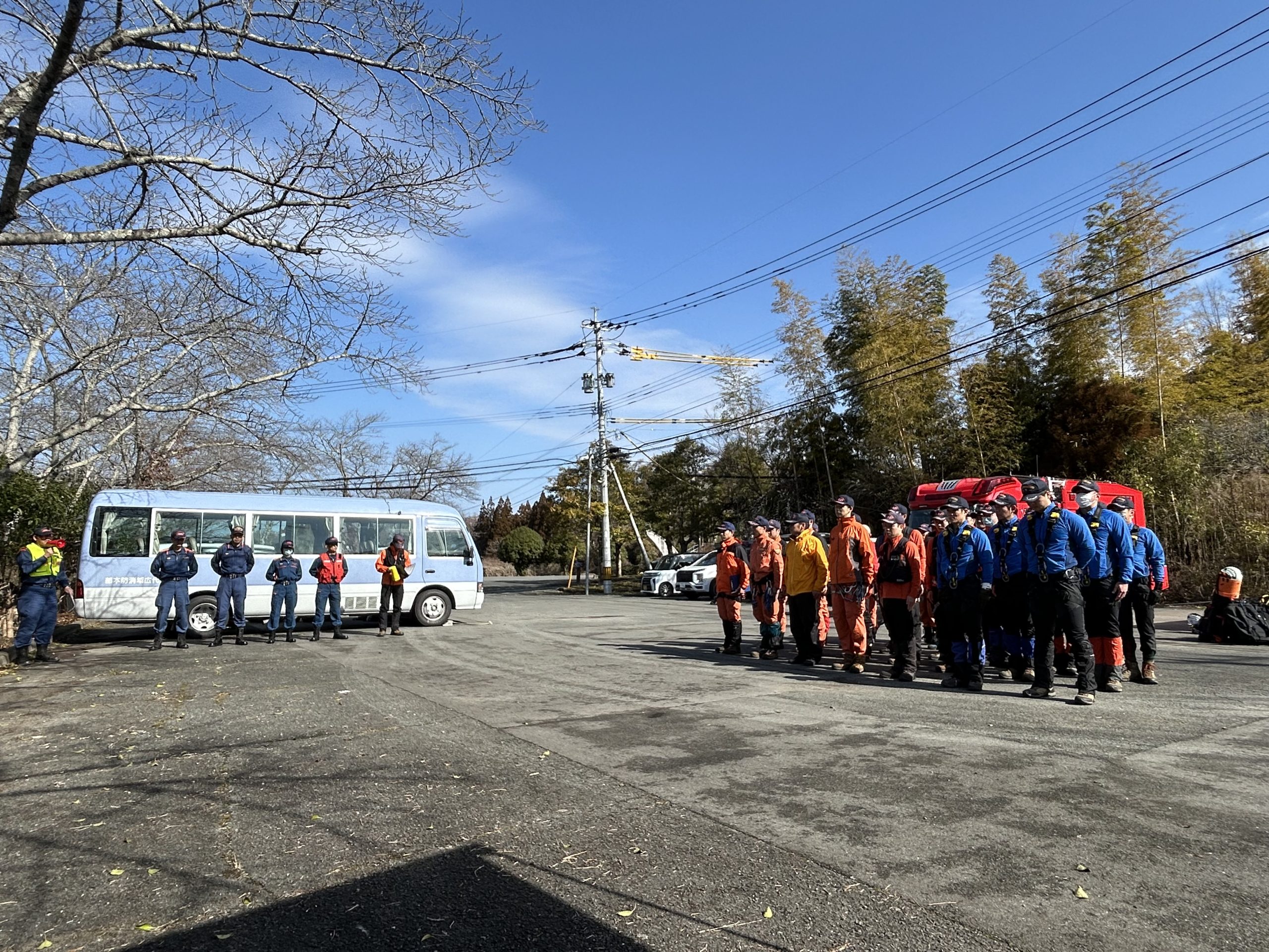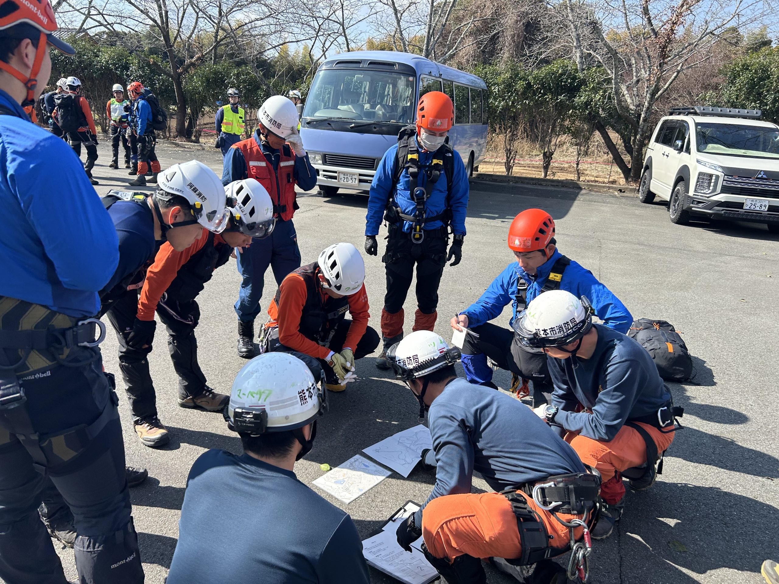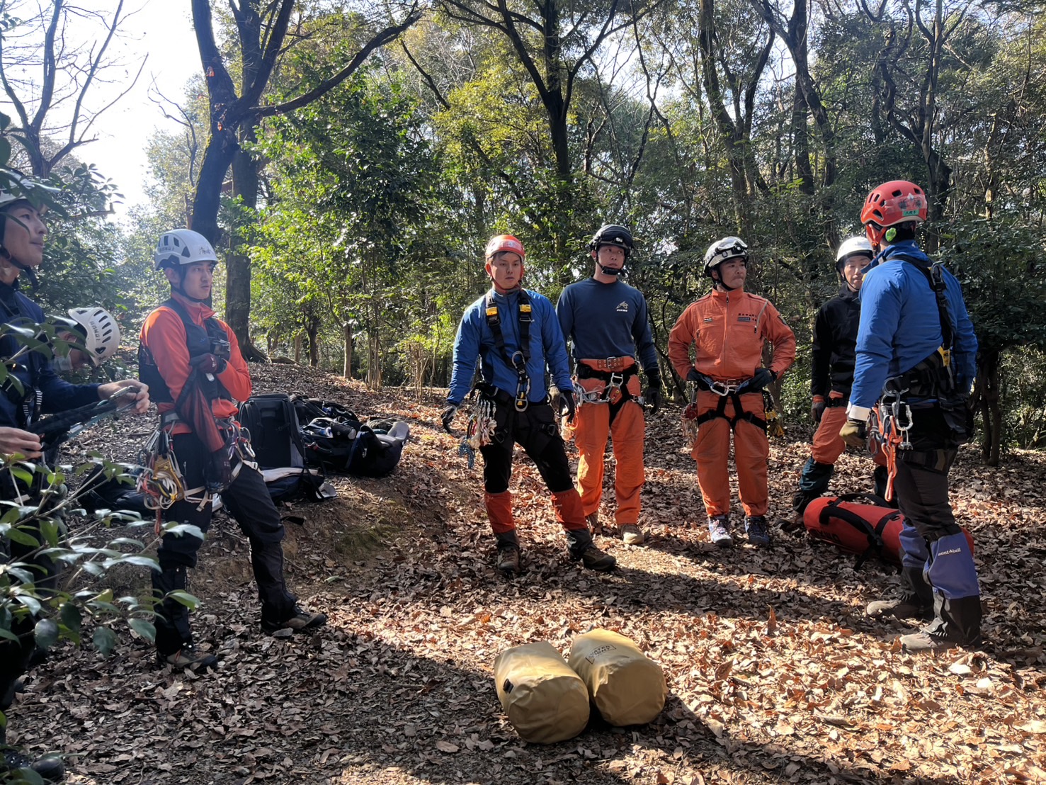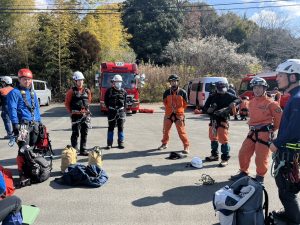 令和8年2月20日に御船町高木の野鳥の森において、熊本市消防局益城西原消防署、阿蘇広域行政事務組合消防本部、八代広域行政事務組合消防本部、上益城消防組合消防本部の4消防本部(局)計40人が参加し、隣接消防との連携・山岳救助技術の向上を目的に合同訓練を実施しました。